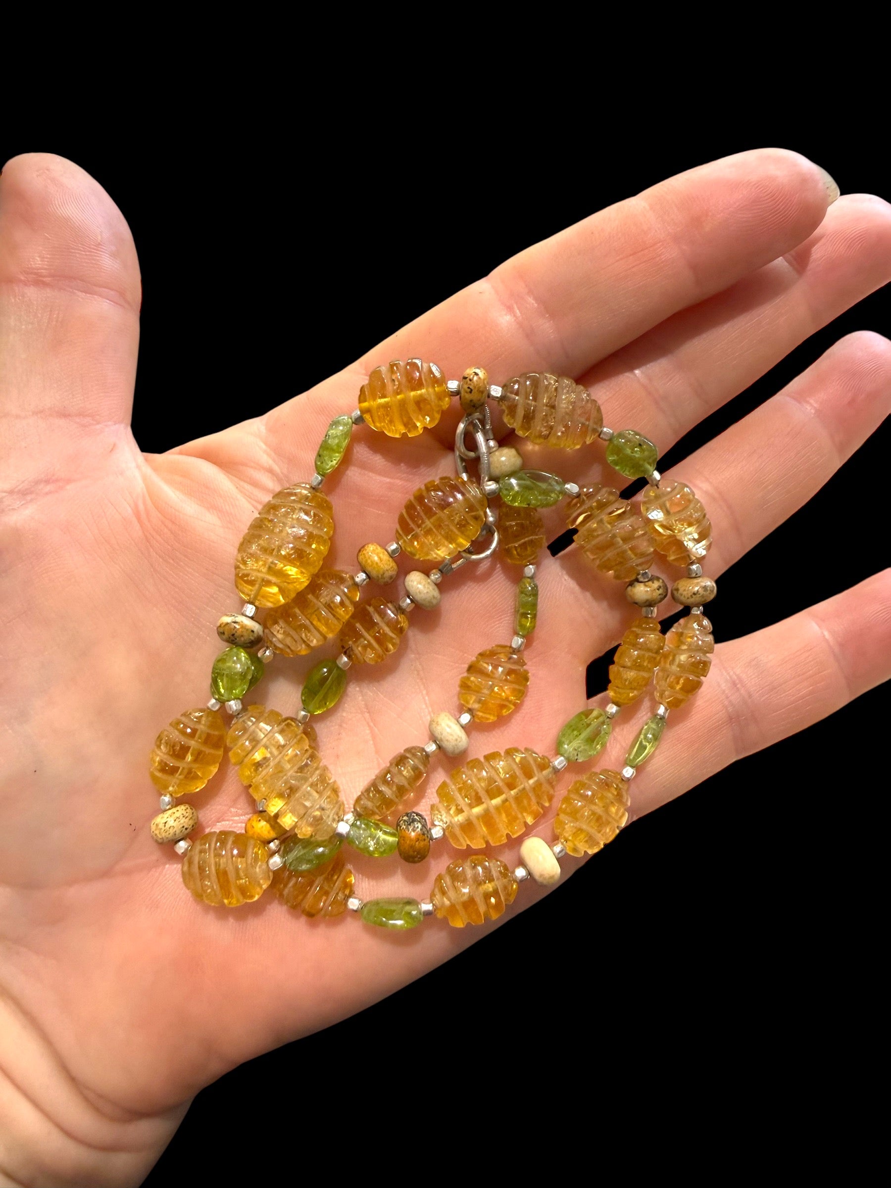 Uniquely different necklace that combine some of our oldest shaped citrine beads with Indianjasper and boulder peridots. We've highlighted the beauty of our necklace by using tiny handmade sterling silver beads between each stone. All finished with sterling silver hook fastenings.