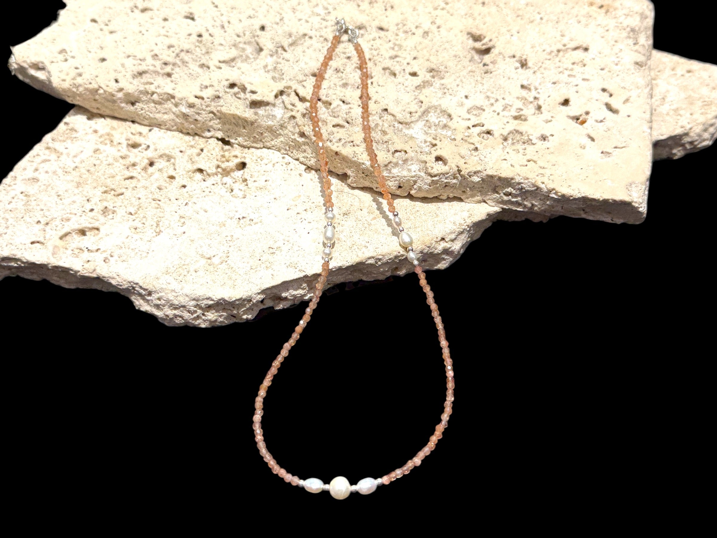 These are our most popular necklaces because they simply suit every skin tone. Natural clear pink/orange sunstone beads are teamed with cultured pearls and sterling silver. A silver lobster clasp complete the look.