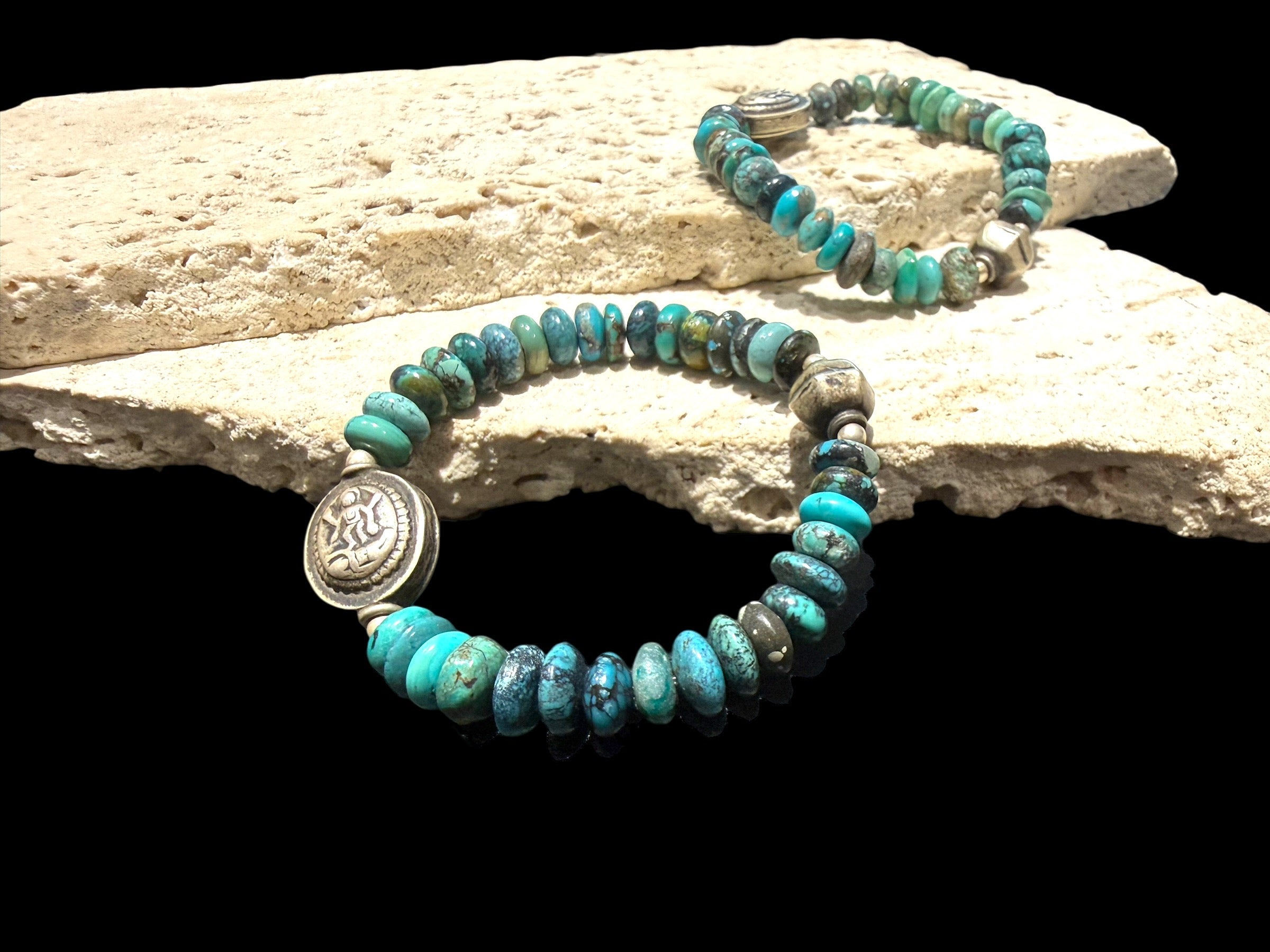 We've teamed rondel/saucer cut Arizona turquoise with a vintage silver Indian bead featuring the goddess Kali, and we've added another vintage silver bead as a counterpoint on the opposite side of the bracelet. Elasticised.