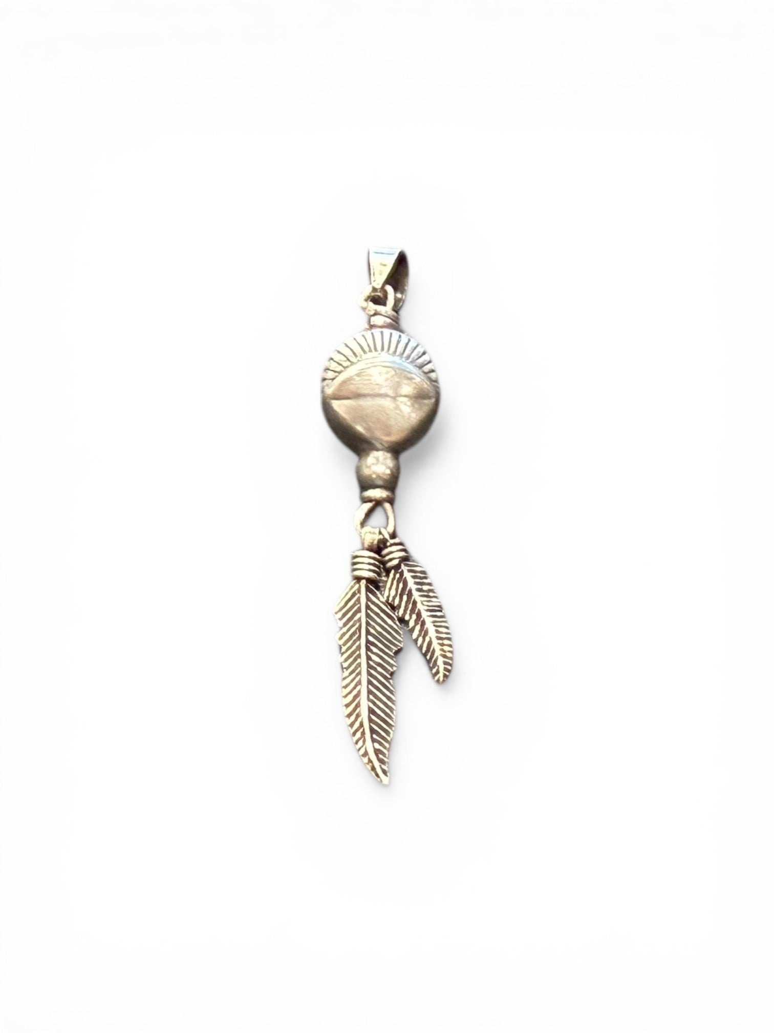Our medicine drum pendant has two feathers dangling below. The beads are vintage and all components are sterling silver. This is unisex pendant