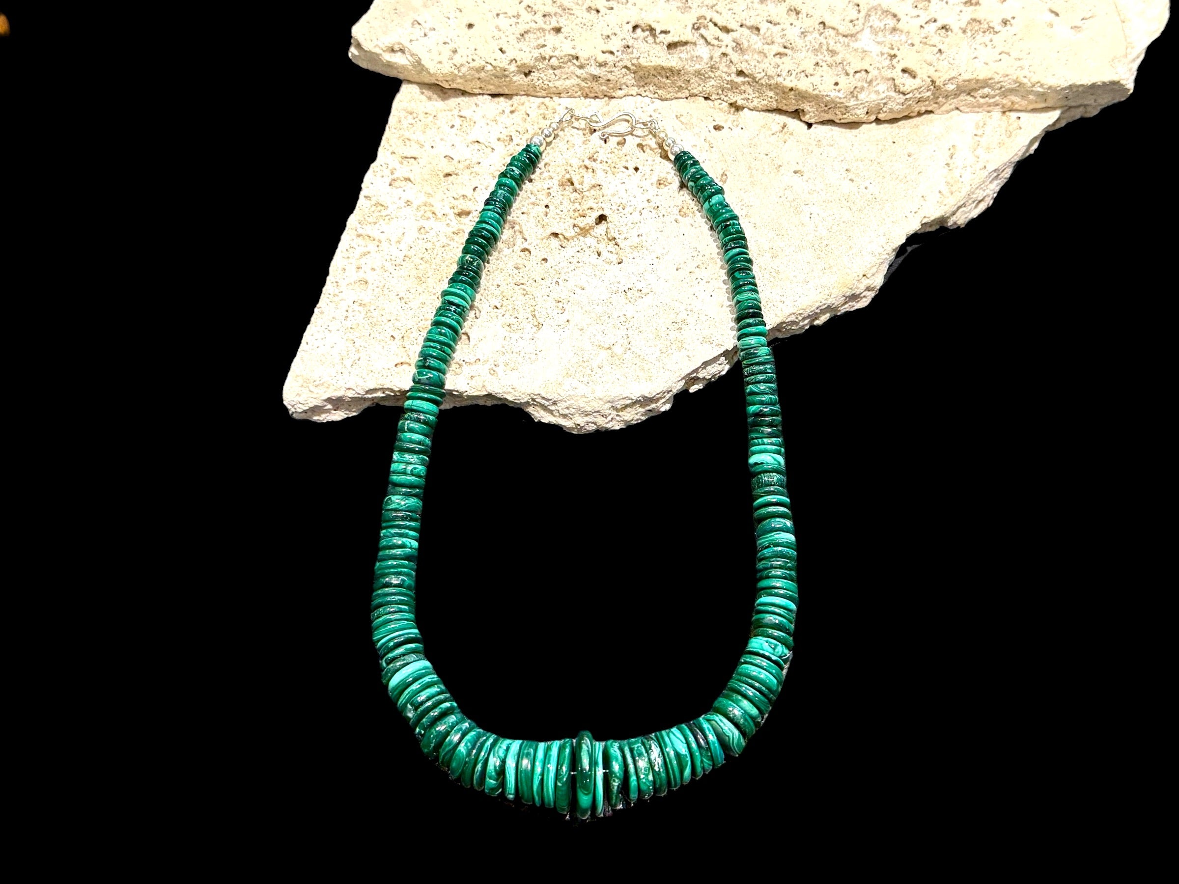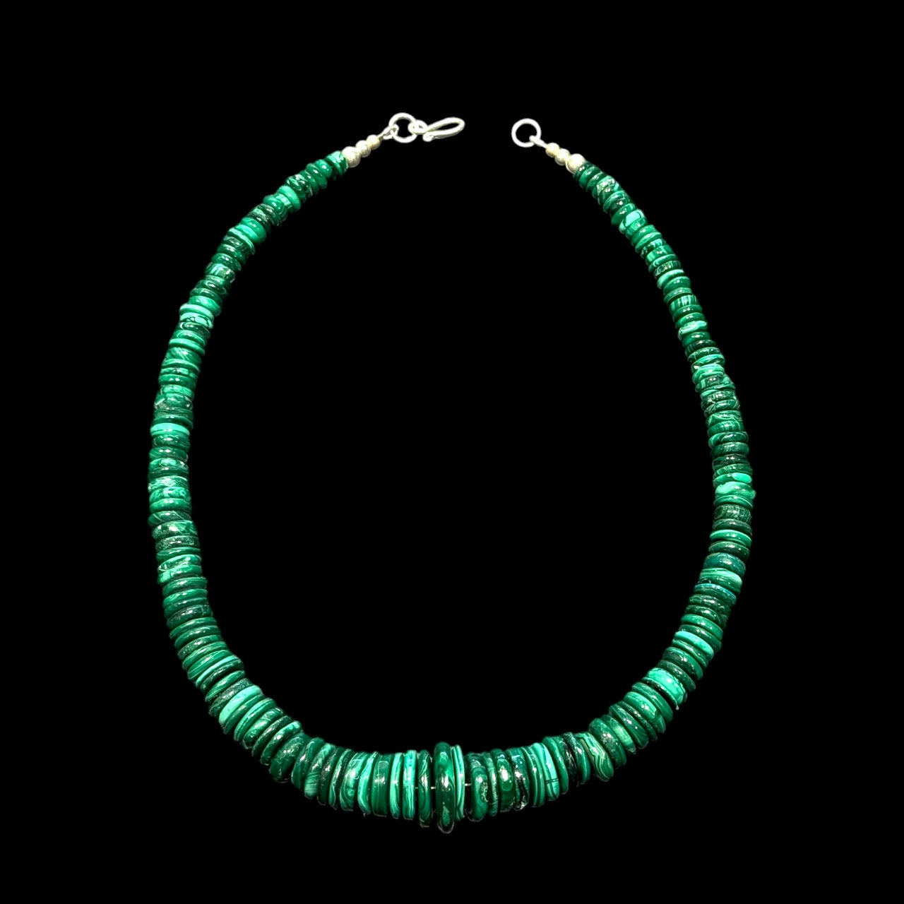 Statement graduated heshi bead malachite bead necklace with sterling silver bead detailing and hook clasp.