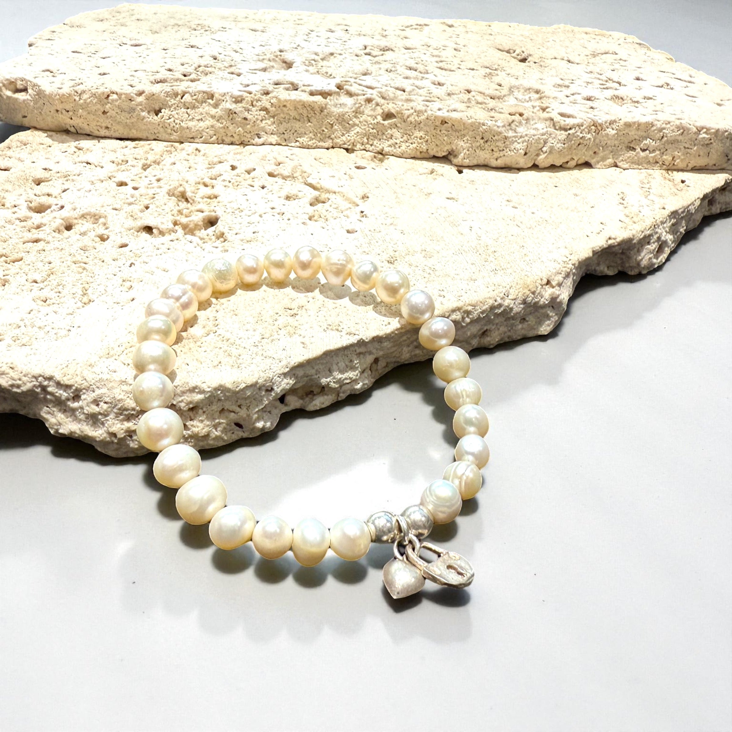 Freshwater pearl bracelet with sterling silver bead and charm detailing. Elasticised stringing for a seamless look.
